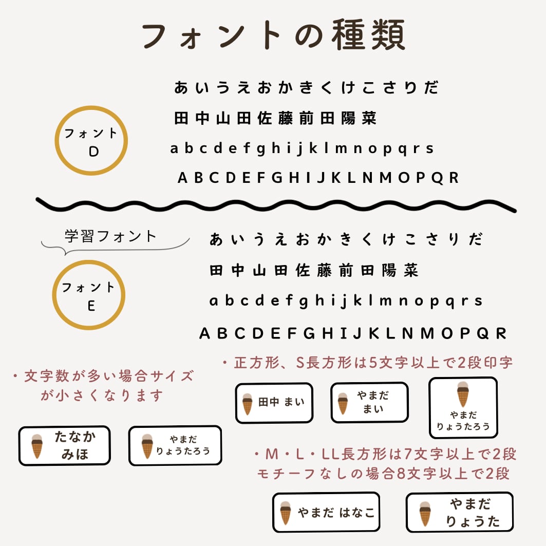 ・正方形、S長方形は5文字以上で2段組で印字