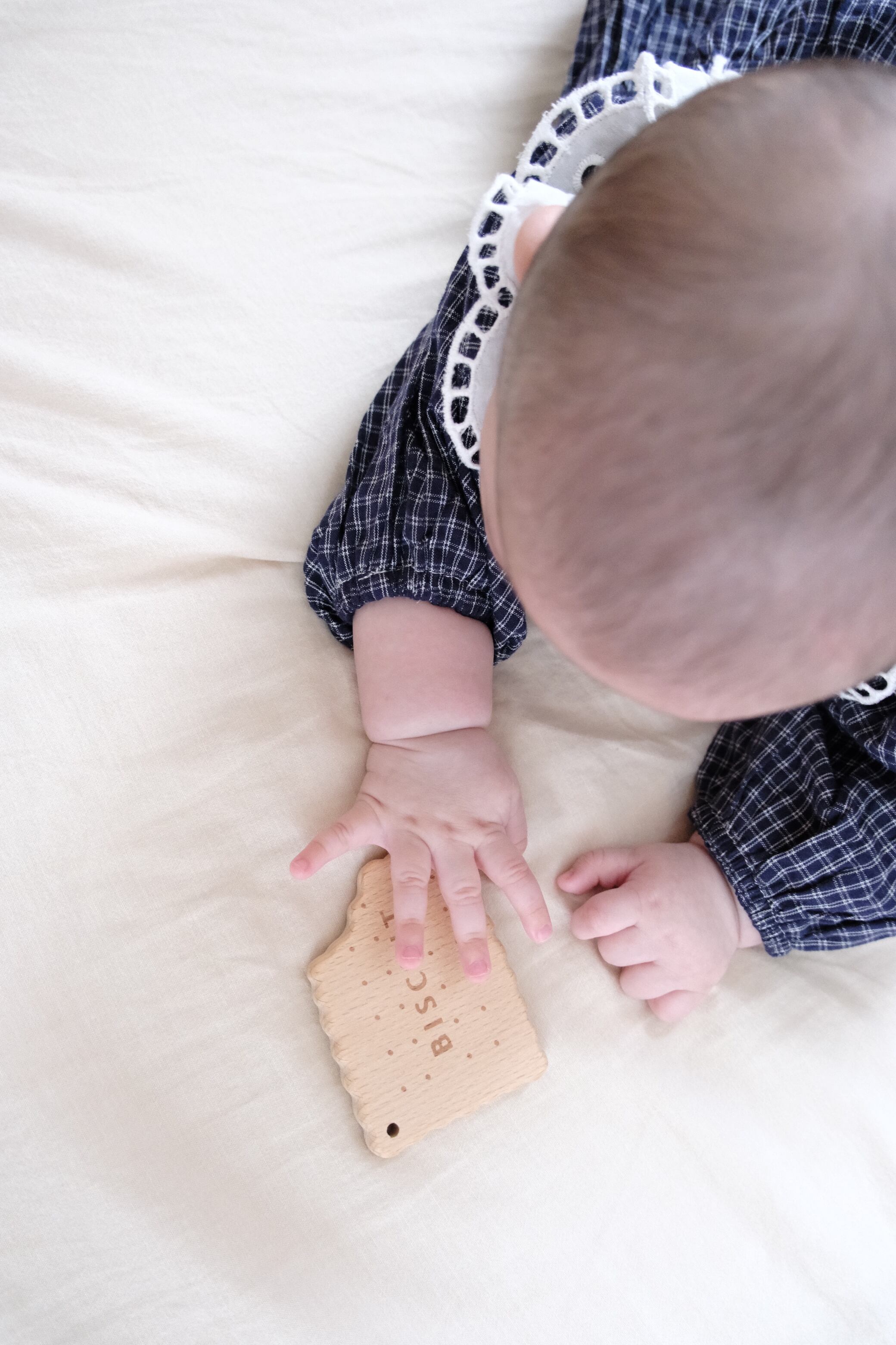 天然木で作られたビスケットをかじったような形の可愛い歯固めです。