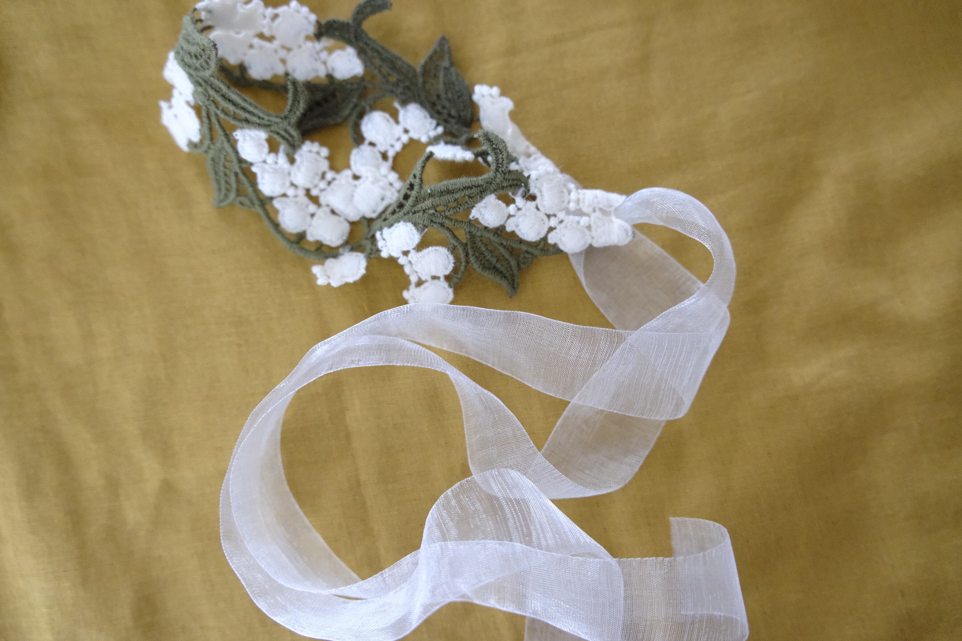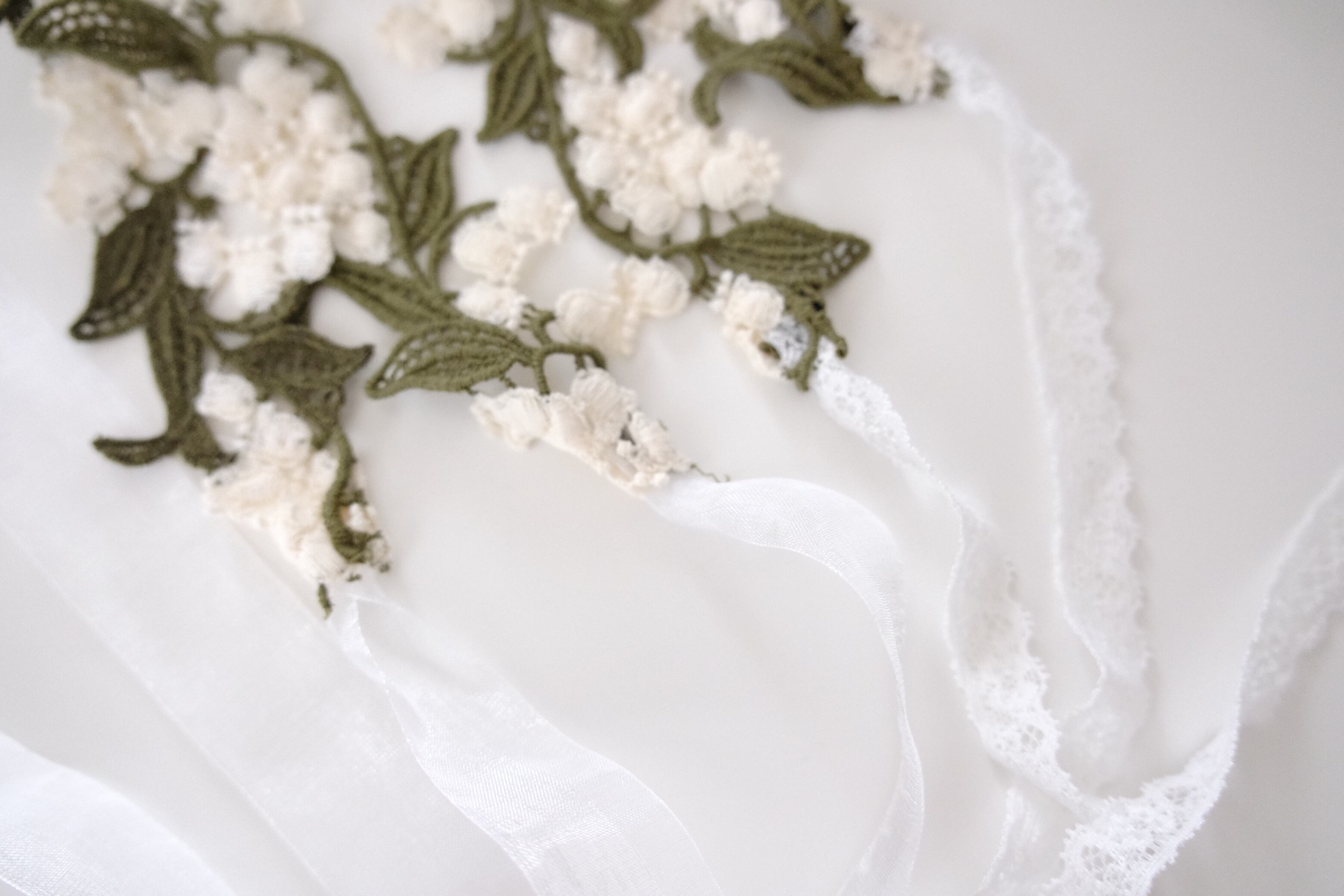 立体感のあるスズラン刺繍の希少なレースを使用したヘアバンドです。